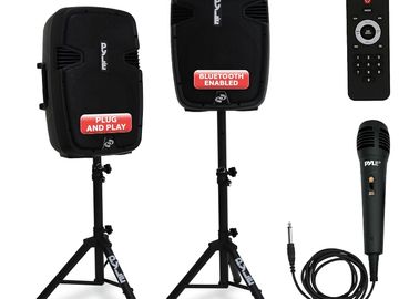 Elevate your event with this comprehensive PA System, Projector & Podium package. Featuring high-quality speakers, microphone, remote, projector and sleek design for professional